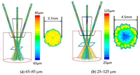 In reality, the particle size of the powder must exist within a range. The distribution of particle size can be represented by the Rosin-Rammler model, which has been widely used in similar research. According to the analysis of 65–85 μm and 25–125 μm powder streams, which are both normally distributed and have a median of 75 μm. As can be seen from Figure 10, the focused spot of powder stream is smaller with uniform particle size. In addition, when the particle size distribution range is large, the powder with smaller particle sizes are concentrated in the center of the spot, unlike that of larger particles. The reasoning is that the powder with a smaller particle size has a larger specific surface area and is more strongly dragged by the gas, so it is more likely to be confined in the central area of the gas flow.