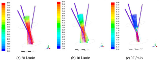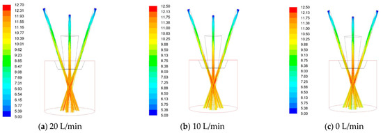 The inner ring laser shielding gas is a non-negligible parameter. In the previous study, for coaxial continuous laser cladding nozzles, the increase of inner ring laser shielding gas will directly affect the convergence height of powder flow. However, for coaxial discrete nozzles, it can be seen from the results in Figure 11 that shielding gas of different rates will flow out through the gap of the powder stream passages, and the impact on the converging position of the powder flow will be greatly reduced from the results in Figure 12.