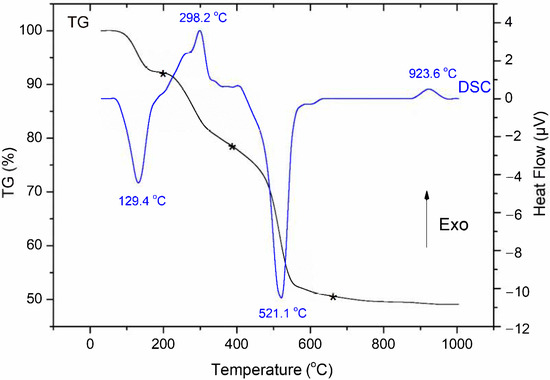 The thermogravimetry (TG) and the differential scanning calorimetry (DSC) curves of the dried sample are presented in Figure 1. The TG curve shows three mass losses in the temperature ranges of 28–210, 210–405, and 405–670 °C. The primary mass loss corresponding to the endothermic peak at 129.4 °C on the DSC curve, is assigned to the physically adsorbed water removal [21,28]. The second one, with an exothermic peak at 298.2 °C on the DSC curve, is characteristic of the chemically adsorbed water release [29]. The last one, with an endothermic peak centered at 521.1 °C on the DSC branch, was due to the thermal decomposition of the NO3− groups used as oxide precursors [30,31]. An exothermic peak at 923.6 °C without the mass loss is attributed to the formation of wollastonite CaSiO3 compound, according to our previous studies [21,22]. From temperatures above 670 °C, no mass loss was observed. Therefore, the suitable temperature for glass sintering is chosen to be at around 700 °C to eliminate the H2O and NO3− components within the sample.