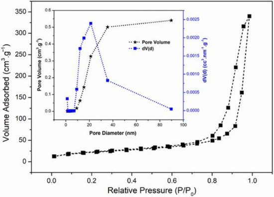 Nitrogen adsorption/desorption isotherm and pore size distribution of bioactive glass.