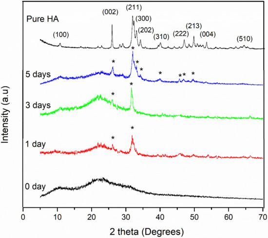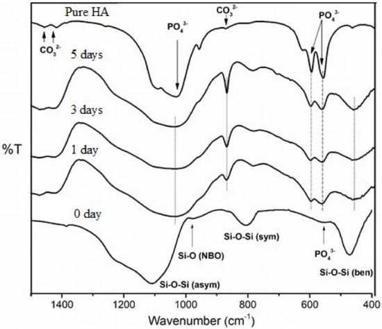 Figure 3 shows the XRD diagrams of glass samples before and after the in vitro experiments in the SBF solution. The XRD pattern of the synthetic bioactive glass exhibits a wide diffraction halo centered at about 23° (2θ). This is a typical characteristic of an amorphous material, confirming the successful synthesis of ternary bioactive glass 58SiO2-33CaO-9P2O5 (wt%) by the free-acid hydrothermal method. After the primary day in the SBF solution, the bioactive glass showed two well-defined peaks at 2θ = 26° (002) and 32° (211), which are attributed to the crystalline hydroxyapatite (HA) phase (well-matched with the JCPDS file no. 90432). As the soaking time increased, these two peaks became sharper and higher in intensity. After 5 days, most of the representative peaks of the HA phase appeared clearly, demonstrating the bioactivity of the synthetic bioactive glass in this study.