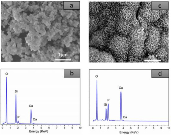 SEM–Energy Dispersive X-ray Spectroscopy (EDX) analyses of the bioactive glass: (a,b) before and (c,d) after 5 days of immersion.