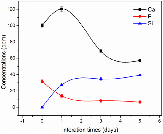 The physical–chemical interactions of the bioactive glass with the physiological environment led to ionic changes in the SBF solution as presented in the Figure 6. The elemental concentrations of Si, Ca, and P in the initial SBF solution were 0 ppm, 100.2 ppm, and 31.4 ppm, respectively. The Si concentration rapidly increased at the beginning time of soaking, and then moderately increased after 3 days. The concentration of Si reached the saturation value after 5 days of immersion. According to the previous studies, a rising in Si concentration is explained by the dissolution of the glassy network through the release of silicic acid Si(OH)4, while the saturation process corresponds to the re-polymerization of the above acids to create a SiO2 silica layer [33,34,35,36]. On the other hand, the concentration of Ca increases at the beginning time of soaking, probably due to the quick exchange of Ca2+ out of the glassy network and H+ in the physiological fluid [37,38,39]. Thereafter, the concentration of Ca strongly decreased after 3 days and reached saturation at 5 days. The decrease of the Ca concentration is expounded by its consumption to make the mineral HA layer on the surface of the bioactive glass [37,38,39]. By contrast, no increase in P concentration was observed after the in vitro experiment. This can be explained by the low content of P2O5 in the synthetic glass and also the rapid consumption of Ca and P for the formation of the apatite mineral layer. This result completely fits with the XRD analysis, where the HA layer was determined after just 1 day of soaking in the SBF solution.