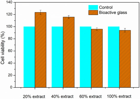 The cell viabilities of the L-929 fibroblast cells directly in contact with the bioactive glass powder for 24 h are presented in Figure 7. The cell viability without contact with the bioactive glass was selected as the control (100%) [27]. Following the standard ISO 10993-5 (Biological evaluation of medical devices—Part 5: Test for cytotoxicity, in vitro methods 2009), the cell viability was calculated as a percentage relative to the control, set as 100%. In the case where the average of cell viability was less than 70%, the material was cytotoxic. The obtained results show that the cell viabilities were 124, 116, 96, 94% for 20%, 40%, 60%, and 100% extracts, respectively. The 20% extract showed the highest value of cell viability, while the 60% and 100% extracts presented a small difference. Therefore, the bioactive glass 58SiO2-33CaO-9P2O5 (wt%) synthesized by the acid-free hydrothermal method presented good biocompatibility in the cellular medium even within the high extracts. The value of cell viability for the bioactive glass in this study is equivalent to those for previous glass systems, such as 45S5 melting Bioglass®, 77S sol-gel glass, and 58S sol-gel glass [40].