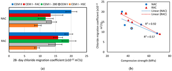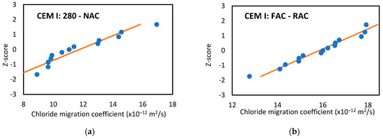 - The negligible influence of these recycled aggregates on the variability of the chloride migration coefficient may be due to internal curing mechanisms, though more research should follow to confirm this hypothesis.