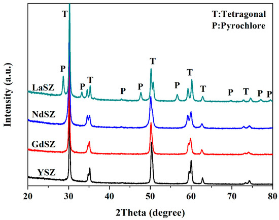 Figure 2 shows the XRD patterns of LnSZ powders calcined for 6 h at 1100 °C, revealing the presence of pyrochlore LZ and tetragonal Ln stabilized ZrO2 phases. This indicates that Ln elements precipitated and segregated to form the LZ phases after the heat treatment. When the Ln2O3 concentration in LnSZ was below 1.5 mol%, the LnSZ powder transformed from the tetragonal (T) to the monoclinic (M) phase during cooling [24], which seems to disagree with the experimental results shown in Figure 2. In this study, the existence of the tetragonal phase in LaSZ powders is due to the following reasons: (1) the concentration of the tetragonal La2O3 in the LaSZ structure is still higher than 1.5 mol%; and (2) the nanostructure of LaSZ powder results in a more stable tetragonal phase than the cubic phase when the grain size is less than 100 nm [25]. Analysis of the other three powders reveals the presence of only the tetragonal phase, and neither the pyrochlore nor the monoclinic phase is observed in Figure 2. This is a testimony to the lack of segregation of the Ln2O3 particles in the LnSZ powders, making their tetragonal structure more stable.