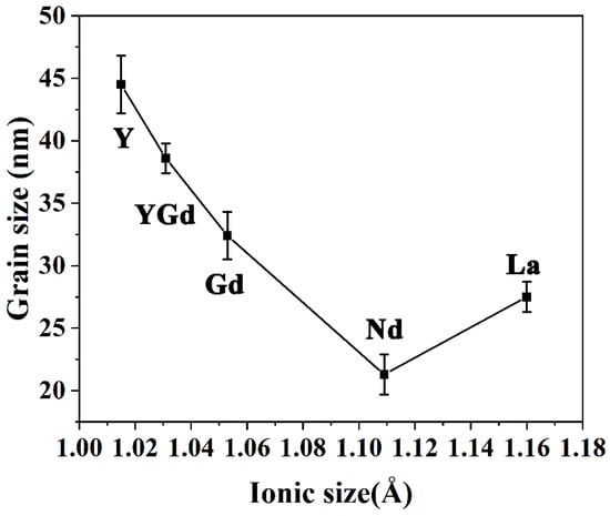 Figure 3 shows the evolution of the average grain size in LnSZ powders with varying composition. With the increasing radius of rare earth ion, the average grain size of LnSZ powder first decreases and then increases. As a result, NdSZ powders possess the smallest grains. Consequently, the average grain size of YSZ can be effectively reduced by the full or partial substitution of Y2O3 phases in YSZ using rare earth elements with large ionic radii. Figure 3 exhibits a noticeable reduction in the growth rate of grains in the case of the Nd2O3 and La2O3 phases. Therefore, both are expected to improve the sintering resistance of ZrO2. However, owing to the precipitation of the second LZ phase, the La2O3 content in LaSZ decreases, leading to the reduction in the inhibition effect of La2O3 on the ZrO2 grain growth to a certain extent. These experimental results are consistent with the results of some previous reports. For example, Matsumoto et al. found that, compared with Er2O3, Al2O3, or SrO oxides, the addition of 1 mol% La2O3 to a 4YSZ phase could significantly improve the sintering resistance of the YSZ system [14].