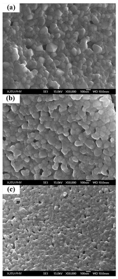 Figure 4 displays the SEM images of GdYSZ samples with different Gd2O3 concentrations, revealing that the average grain sizes in the powders are below 100 nm, which is in good agreement with the above-mentioned XRD results. The smallest average grain size is observed in the GdSZ powder, whereas the largest one refers to the YSZ powder. This result indicates that the YSZ powder is much denser than the Gd2O3-doped YSZ powder, with an obviously smaller number of micro-pores in its structure. Therefore, the addition of Gd2O3 effectively inhibits the mass transfer of ZrO2 and improves the stability of the internal holes, as shown in Figure 4.