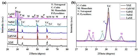 Figure 5 shows the XRD patterns of LnSZ powders exposed to 90 h heat treatment at 1300 °C. Figure 5 demonstrates that the full width at a half-maximum (FWHM) of the diffraction peak is significantly decreased, indicating the noticeable grain growth after high-temperature annealing. Moreover, a large fraction of monoclinic ZrO2 was detected in LaSZ and NdSZ. Furthermore, no traces of the monoclinic phase were highlighted in GdSZ, GdYSZ, and YSZ powders after the long-term exposure at 1300 °C. The cubic phase along with some amount of the tetragonal phase was present in all the powders, except for LaSZ. This indicates that the tetragonal LaSZ decomposed into the cubic, monoclinic, and pyrochlore phases, respectively, which could be attributed to the precipitation of La2O3 in LaSZ. As a result, M-ZrO2 was found to be more stable than T-ZrO2 when the content of La2O3 was less than 1.5 mol% with a large grain size (large than 1 μm). This is also applicable to NdSZ. However, with the increasing Nd content, Nd2O3-stabilized ZrO2 with a cubic structure is expected to be formed, rather than Nd2Zr2O7 (NZ) with a pyrochlore structure. Furthermore, a serious segregation of Gd also occurred in GdSZ, which was caused by the decomposition of GdSZ into the cubic and tetragonal Gd2O3-depleted phases. Figure 5b presents that GbSZ possesses two pronounced peaks corresponding to (111) and (110) planes, attributed to the cubic and tetragonal phases, respectively. A similar decomposition of the tetragonal phase also emerged in GdYSZ and YSZ, leading to the formation of the cubic phase. As a result, the phase stability of LnSZ increased with the decrease of the ionic radius of the dopant.