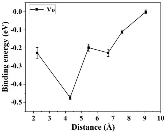To study the grain boundary segregation of rare earth ions and oxygen vacancies via molecular dynamics simulation, the most stable configuration was selected. The binding energy between Y3+ and VO (oxygen vacancy) is displayed in Figure 8. The binding energy increases with the decrease of the Y3+-VO distance until the Vo occupied the second nearest neighbor site of the Y3+ ion. The smallest energy difference was −0.474 eV, which shows a good agreement with the references’ reports [31]. The Y3+ ion with a large ionic size (compared with Zr4+) preferred to have eight neighboring oxygen ions, whereas the Vo tended to occupy the nearest neighbor site of the Y3+ ion. As a result, the optimal site of VO in YSZ is the second nearest neighbor site to accommodate atomic strain and Coulombic interaction. Moreover, the binding energy of the Y3+-Y3+ defect cluster is −0.23 eV, verifying that the rare earth ions also prefer to form a cluster to decrease the atomic strain induced by the ionic radial mismatch. The most stable configuration of YSZ is the configuration with the Y3+-VO-Y3+ defect cluster.