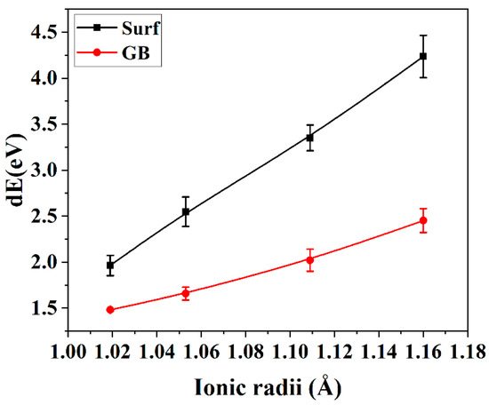 Figure 9 displays the variances in energies associated with grain boundaries and surfaces undergoing the segregation of rare earth dopants. The segregation of elements with large ionic radii at the grain boundary or at the surface was found to effectively reduce their energies, and the larger the ionic radius, the lower the grain boundary (surface) energy. Furthermore, Figure 9 illustrates that the rare earth dopants with larger ionic radii prefer to segregate on the surface rather than at the grain boundary, because, the larger the rare earth element, the stronger the difference between the grain boundary energy and the surface energy. As a result, the dihedral angle around the pores increases with the ionic radius of the rare earth element, resulting in the higher porosity in Gd2O3-doped ZrO2 compared with YSZ.