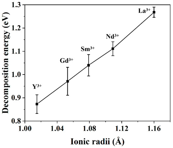 The aforementioned discussion indicates that the most stable configuration of YSZ is the configuration with the Y3+-VO-Y3+ defect cluster, and the decomposition of rare earth-doped ZrO2 could be ascribed to the formation of RE3+-Vo-RE3+ clusters. From this perspective, the stability of rare earth-doped ZrO2 could be evaluated by using the molecular dynamics simulations. The decomposition energy is defined in terms of the following relationship: