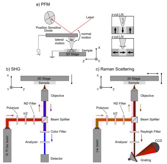 Therefore, we will combine here PFM, SHG, and RS for the analysis of x-cut TFLN down to the nanometer resolution. We will start by briefly reviewing the capabilities of every method and identify their strengths and weaknesses in order to determine the key performance factors in TFLN. Furthermore, we will identify the challenges for each method that may be addressed in future work.