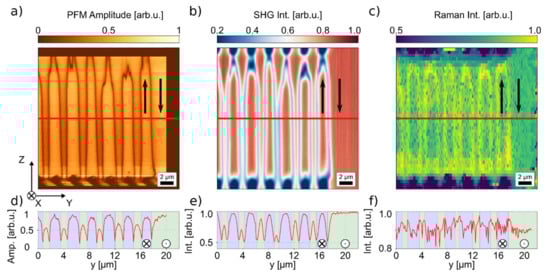 In principle, PFM is also sensitive to vertically stacked domains in the depth of the sample. If domains of different orientations are stacked upon each other, their piezoelectric response will partly cancel. Hence, a decrease in PFM amplitude may be expected. However, as the electric field rapidly decays with the increasing distance away from the tip, i.e., typically with 1/r, where r is the tip radius, PFM provides only a limited and nonlinear depth resolution. Experiments performed on vertically stacked domains in z-cut bulk lithium niobate indicated that domains up to a depth of 1.7 µm could be detected with a normal (deflection) mode (90% criterion) [39]. This suggests that in principle PFM allows imaging the domain constitutions into the full depth of these TFLN samples, as film thicknesses typically measure 300–700 nm. Indeed, a comparison of the SHG and PFM images in Figure 3 suggests that some of these domains might not be fully inverted in the full TFLN sample depth, as deduced from the reduced PFM amplitude of the encircled domain in Figure 4c. As seen close to the top sample edge where the negative electrode for poling is located, the color contrast is slightly shaded as compared to the fully poled domains. This information is corroborated between both the PFM and SHG information. Nevertheless, further experiments and theoretical analysis are necessary to calibrate the depth resolution in PFM for this type of sample, since the amplitude does not decrease linearly with the domain depth. Furthermore, in clear contrast to previous depth-resolved PFM experiments on z-cut bulk LN, x-cut TFLN features a different crystal orientation. Hence, smaller piezoelectric tensor elements and/or different cantilever motions are addressed. Moreover, the used substrate material stack will certainly influence the electric field distribution, as well.