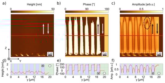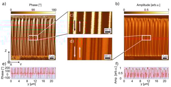 The high lateral resolution makes PFM the method of choice when it comes to imaging and detecting sub-micrometer polar features, as shown in Figure 5 for a TFLN sample with a periodicity of Λ = 0.8 µm. Such samples are not accessible with diffraction-limited (optical) methods, as these periodicities lie in the range of the Abbe limit. Similar to Figure 4, the results on the submicron structure in Figure 5 show no domain related contrast in the topography. While the PFM phase shows a domain polarity contrast, the PFM amplitude allows distinguishing between individual domains with DW-DW distances of less than 200 nm and individually resolved DWs (see Figure 5b,d).