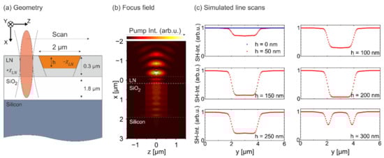 To demonstrate the sensitivity for the inversion depth of SHG microscopy, we have performed numerical simulations of the imaging process for a typical x-cut film of 300 nm thickness on a 1.8 µm oxide layer, similar to our structure in Figure 1a. For simulation, we used the code that was previously developed [19,23]. Figure 6a depicts the simulation setup. Here, we assume an inverted domain of 2 µm width with a hexagonal cross-section, as it can be expected for x-cut films. For the simulation, the domain extends infinitely along the z-axis. Figure 6b shows the calculated focus field for a NA of 0.8 and a wavelength of 800 nm, which is used for all simulations reported in this paper. Figure 6b shows that reflections play a crucial role in the fundamental field. As shown previously, similar conclusions can be drawn for the reflected SHG signal, which is the main SHG signal that is detected. In our simulations, the focus is moved in increments of 50 nm and the reflected SHG intensity collected by the objective lens is calculated. This simulation was performed for different depths of inverted domains in 50 nm increments, and the result is plotted in Figure 6c. These simulations show that only for a fully inverted domain (h = 300 nm), the SHG signal level within the domain recovers and reaches up to the bulk value (h = 0 nm). For this case, only vertical DWs lead to a signal decrease, i.e., a domain wall contrast is observed. The simulation demonstrates that due to the coherent nature of the process, domain inversion depths of much less than the optical resolution can be detected by SHG.