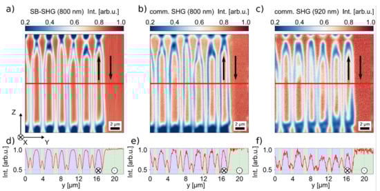Due to its nature as a coherent optical process, SHG microscopy is further sensitive to the inversion depth well below the optical depth of focus. If domains of opposing directions are stacked vertically, the signal generated from the opposing domains will interfere destructively resulting in a reduced signal as compared to the fully inverted or non-inverted single domain. As SHG scales quadratically with the interaction, this allows sensitively detecting the stacked domains with an accuracy of tens of nanometers [23]. This is possible for TFLN, since the coherent interaction length of SHG in the forward direction (“co-propagating” phase matching) measures about 1.28 µm for 800 nm fundamental light, which is larger than the typical film thickness used in integrated optics (<1 µm). The light generated in the forward direction can be measured even in the backward detection due to the high reflectivity of the substrate. In SHG, the light is also directly generated in the backward direction. However, due to the short coherent interaction length (~45 nm) and the quadratic scaling with the interaction length, this counter-propagating light is two to three orders of magnitude weaker in intensity. It should be noted that using a nonlinear substrate, e.g., LN rather than a silicon wafer, may significantly influence the detected SH light, since the SH light is not only generated in the film, but also in the substrate. Further insights into the SHG imaging process can be found in our previous paper [23].
