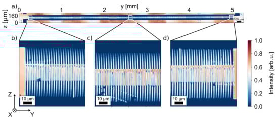 To demonstrate the capability of SHG for large-scale imaging of complete chips, we have visualized the domain structures along a full 5 mm electrode with the Leica microscope. The result is displayed in Figure 8a. In Subfigure b–d, detailed zoomed-in images taken from the large scan are shown. The zoomed-in frames exhibit similar features as the images in Figure 7. This means that even at this large scale, no loss of information is observed and the poling quality, e.g., poling period, homogeneity, duty cycle or poling depth, can be analyzed for a full wafer. The large image in (a) is cut from a stitched image of 20 frames, each with a size of approximately 260 × 260 µm2. To account for the non-perfectly planar mounting of the TFLN sample (approximately 50 µm height difference along 5 mm), a depth scan over 50 µm with a step size of 5 µm was conducted for each frame. Due to the slightly different focus in each frame, slightly different overall intensities are observed, leading to the large-scale intensity oscillations observed along the chip. As the previous theoretical analysis indicates, the focus position does not influence the domain wall contrast [23]. Taking the images at all different planes into account, a total of 200 frames were scanned for this image. Assuming an imaging time of ~1 s per frame and accounting for (automatic) sample repositioning, a total imaging time in the range of only a few minutes is required for the example shown here. The scan speed may be further increased though at the cost of signal-to-noise ratio. Whenever a low magnification objective lens is used with a larger field of view, even higher imaging speeds are possible at the cost of lateral resolution. This example demonstrates that complete chips (~cm2) can be imaged within an hour or even less.