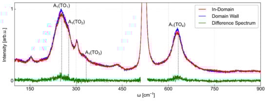 The Raman spectra in a virgin domain and on a domain wall are compared in Figure 9. Only the four indicated phonon peaks are generated in the LN thin film, whereas the SiO2/Si substrate causes a strong background with the characteristic triply degenerate Si peak at 521 cm−1. For this reason, it is essential to keep the laser focus in the thin film and maximize the LN scattering signal, which is achieved by the autofocusing routine detailed in Section 2. This special treatment massively prolongs the measure time per pixel, which makes Raman investigations the slowest of the techniques shown in this work (the total acquisition time for the shown Raman colormaps including autofocus is ~15 days; the pure acquisition time without autofocus amounts to 27.6 h).