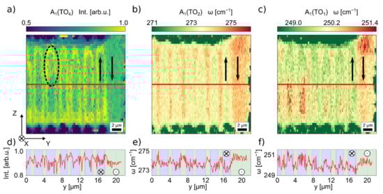 A peculiar behavior can be seen for the A1(TO1) peak frequency mapping in Figure 10c. Similar to the A1(TO4) intensity, this feature shows a domain wall contrast with the assumed sensitivity for poling completeness, but in the unpoled region of the sample (upper right area of the colormap), inhomogeneities of the signal, i.e., a phonon frequency change of ~1.5 cm−1, can be seen although there is no evident structuring. The cross correlation with PFM and SHG measurements shows that no structural features are to be expected in this area. A possible explanation for this observation is a sensitivity to mechanical stress and/or electric fields. Previous works on the pressure dependence of LN phonon features [30] suggest that the isotropic pressure dependence coefficient of A1(TO1) is ~0 cm−1/kbar, which would directly contradict this assumption. However, that work gives no information on the influence of uni- or biaxial stress fields. Stone et al. [29] ascertained the scattering dependence on apparent electric fields, but only listed data for A1(LO) and E(TO) phonons. Assuming that the coefficient of A1(TO4) is in a comparable order of magnitude such as A1(LO4), the electric field is estimated to be in the order of 45 kV/mm. In both cases of strain and electric field dependence of the phonon frequency, future work is indicated to extend the fundamental knowledge on these dependencies and evaluate our assumptions.