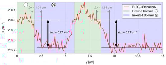 An example of Raman imaging with E(TO) modes is shown in Figure 11. Here, we have analyzed a different electrode of the same sample that provides larger domains, which allows a more clear visualization of the phonon frequency shift between oppositely-poled domains. The resulting larger domain sizes allow a clearer distinction of the phonon properties. The phonon frequency of the E(TO2) mode provides a clear domain polarity contrast. The frequency change between the oppositely-poled domains has been applied to the pressure and electric field correlation studies. With a pressure dependency coefficient of 0.05 cm−1/kbar [30], the E(TO2) frequency change of −0.27 cm−1 from pristine to poled domain would correspond to −5.4 kbar, i.e., a tensile force acting on the LN thin film due to the polarization change. With an electric field coefficient of −0.01 cm−1/(kV/mm) [29], a change of electric field by 27 kV/mm between oppositely-poled domains can be deduced. While this number is larger than the coercive field in undoped, bulk LN [59], several works reported that for poling doped TFLN (which even has a lower coercive field) high electric fields need to be applied reaching values of up to 40–60 kV/mm in order to achieve successful poling. While some authors suspected this to be an effect of the poling electrode design and to facilitate nucleation, our results indicate that these high fields maybe necessary to overcome internal limits, e.g., imposed fields and charges required to stabilize h2h and t2t DWs. Further research is necessary.