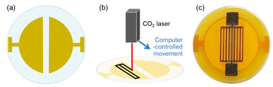 To fabricate a QCM gas sensor able to incorporate additional electrodes, the sensing materials should be deposited sequentially on a quartz crystal. Generally, they require a tedious masking and thermal evaporation processes with vacuuming to deposit the electrodes on a quartz crystal [7]. This problem can be addressed by applying a laser process to the polymer-coated QCM to prepare electrodes and sensing materials in one step at room temperature. Laser-induced graphene (LIG) is a carbon nanomaterial that can be easily synthesized using a CO2 laser to convert polymer films [9,10,11,12]. This one-step process is inexpensive, scalable, and compatible with patterning [13]. LIG exhibits high electrical conductivity and high porosity, and because of that, it has been used in several applications like supercapacitors [9,13], adsorbents [14], and sensors [15].