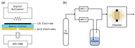 Schematic diagrams of the instrumental setups. (a) electrical connections for the QCM and resistance measurement. (b) setup for gas sensing.