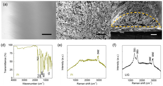 SEM images of (a) spin-coated PI film before LIG patterning. SEM images of (b) top view and (c) cross-sectional view of the on-film fabricated LIG. Scale bars: 20 μm. (d) FT-IR spectroscopy result of the PI film. Raman spectroscopy results of (e) PI film and (f) LIG.