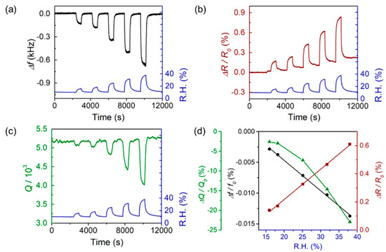 The changes in f, R, and Q, which were measured simultaneously during moisture sensing (Figure 4a–c), were induced by the gas adsorption but the detailed mechanisms differ as follows.
