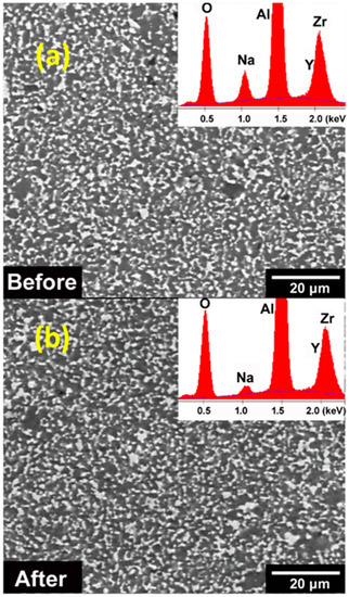 Figure 1a shows an SEM micrograph of an as-converted Na-β″-alumina + YSZ sample. Figure 1b shows an SEM image of the sample after ion exchange in LiNO3 for 24 h. No microstructural changes are observed, consistent with expectations, since the only change that occurs is the partial replacement of Na+ by Li+ in Na-β″-alumina. Also shown in insets are EDS scans. Lithium is too light to be detected. However, it is seen that in the partially ion-exchanged sample, the sodium count is lower, consistent with its partial replacement.