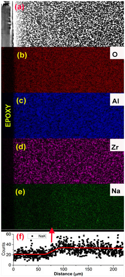 (a) An SEM image of a sample that had been ion exchanged at 300 °C in LiNO3 for 2 h. The micrograph shows ~250 microns of the sample. The microstructure is similar to that in Figure 1. (b–d) show respectively EDS maps of O, Al and Zr. All three are uniform through the width of the image. (e) An EDS map of Na. As seen in the map, there is a distinct change in color at approximately 80 microns. This suggests that in 2 h, lithium ion exchange had occurred to a depth of about 80 microns. The demarcation line is marked by a red arrow. (f) Actual EDS counts of Na showing a distinct change in counts at about 80 microns.