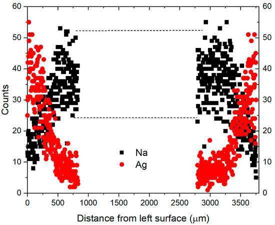 EDS line scans of a sample ion-exchanged in AgNO3 at 300 °C for 1 h. The “left” surface was arbitrarily chosen from one of the planar surfaces of a disc sample.