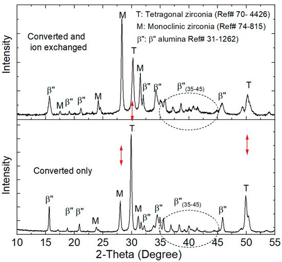 Comparison of samples without (converted only) and with ion exchange for 24 h at 370 °C in LiNO3. The characteristic β″-alumina peaks are labeled (mainly for peaks at 16°, 32°, 46° and a group of low scattered between 35°–45°). Both tetragonal and monoclinic phases of zirconia can be seen in the figure. Tetragonal to monoclinic phase transformation was observed based on relative intensity change of two zirconia phases. The sample was very strong and exhibited no obvious cracks. Double arrows indicate sign of tetragonal to monoclinic zirconia transformation after extended ion exchange period.