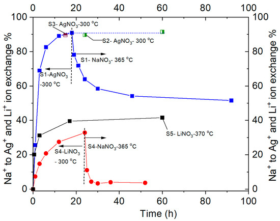 Measured Ag+/[Ag+ + Na+] and Li+/[Li+ + Na+] ratios after ion exchange in AgNO3 and later after reverse ion exchange in NaNO3 as a function of time from five converted samples. Li ion exchange was conducted at two temperatures; 300 °C and 370 °C.