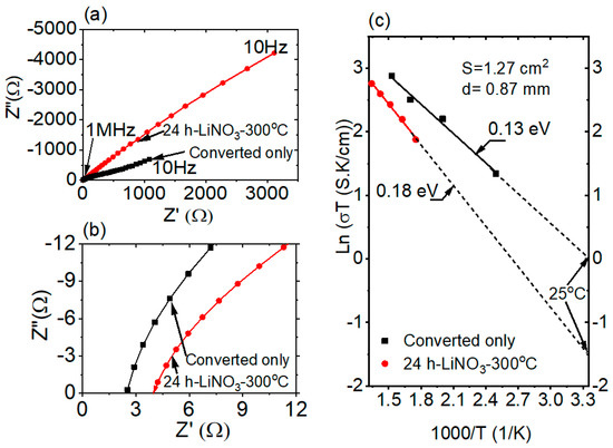 Ionic conductivity measured by EIS on a fully converted sample and after ion exchange for 24 h in LiNO3 at 300 °C. (a) EIS spectra for a fully converted sample (EIS measured at 381 °C) and after ion exchange for 24 h in LiNO3 at 300 °C (EIS measured at 387 °C). (b) Enlarged EIS spectra for a). and intercept with real axis is taken as the total ionic conductivity; (c) Arrhenius plots of the measured conductivity on a fully converted sample and after ion exchange in LiNO3 for 24 h at 300 °C.