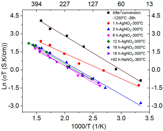 Figure 8 shows Arrhenius plots of the ionic conductivity after silver ion exchange for various periods of time. As seen in the figure, the conductivity decreases with increased Ag+/[Ag+ + Na+] ratio and saturated in about 3 h. Reverse ion exchange by NaNO3 did not recover the conductivity to the initial value in the as-converted state.