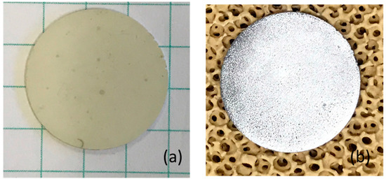 (a) A sample of Ag-β″-alumina + YSZ. (b) The sample after heat treating at 900 °C in air showing metallic color.