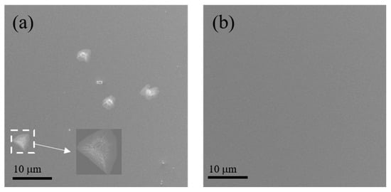 Figure 3a,b are the SEM images of the HgCdTe surface of Sample 1 and Sample 2. Figure 3a is the SEM image of Sample 1. The figure inset is an enlarged image of a surface defect. Larger voids will be formed on the surface at lower Hg flux or higher growth temperature (as shown in Figure 3a). The size of the voids depends on the degree of Hg deficiency []. As the degree of Hg deficiency becomes more serious, the Hg-deficiency gradually increases, and the size usually does not exceed 30 μm. Figure 3b shows the surface morphology of Sample 2 without Hg-deficiency. Obviously, the macroscopic defects of HgCdTe film grown at 151 °C are less than those of HgCdTe films grown at 155 °C. The surface quality of HgCdTe epilayer is very sensitive to the growth conditions owing to the low adhesion coefficient of Hg. Therefore, the growth temperature plays a crucial role in the surface quality of HgCdTe crystals under the condition of constant BEP ratio.