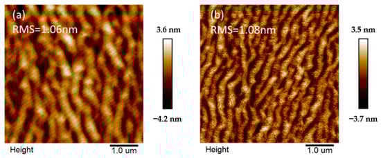 Figure 4 shows the AFM images of HgCdTe surface of Sample 1 (a) and Sample 2 (b). As can be seen from Figure 4, the roughness (RMS values) of both samples is less than 2 nm, indicating the smooth surface of the HgCdTe films. Meanwhile there are nano-ripples along the [11] direction on the surface of the both samples, similar with the report []. The nano-ripples can be attributed to meandering macro step edges formed due to an instability in the step flow growth mode. Nano-ripples are affected by growth temperature and lattice mismatch between substrate and epilayer. The nano-ripple spacings of Sample 1 and Sample 2 are approximately 0.33 and 0.25 μm, respectively. The spacing between HgCdTe nano-ripples of Sample 1 (grown at 151 °C) is smaller than that of Sample 2 (grown at 155 °C) and the height is lower than that of Sample 2, indicating that the density of HgCdTe nano-ripples grown at 151 °C is higher than that of HgCdTe nano-ripples grown at 155°C. Nano-ripples morphology is affected by the availability of atoms on the surface []. The availability of surface atoms is closely related to growth conditions such as growth temperature, so the surface morphology under different growth conditions is different.