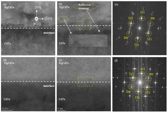 The interface of the CdTe buffer layer and HgCdTe epilayer was characterized by scanning transmission electron microscopy (STEM), as shown in Figure 5a–c for Sample 1 and Figure 5d–f for Sample 2. As can be seen from Figure 5a, there is an obvious interface between the HgCdTe film grown at 155 °C and CdTe buffer layer. Figure 5d shows that there is no obvious interface between HgCdTe grown at 151 °C and CdTe, and no obvious twinning and stacking fault. Figure 5b,e shows the enlarged STEM images of Sample 1 and Sample 2, respectively. As can be seen from Figure 5b, lattice distortion occurs in the epilayer, and stacking fault can be found in the inset. The crystal lattices before and after stacking faults are symmetrical, indicating the presence of twins in the epilayer, while in Figure 5e, no reflection twinning can be seen. Figure 5c shows the fast Fourier transform (FFT) pattern at the interface between HgCdTe and CdTe of Sample 1. It can be seen that there are two diffraction lattices and the lattice is blurred, which indicates the existence of stacking faults and micro-twinning in the HgCdTe epilayer. Figure 5f shows the FFT pattern at the interface between HgCdTe and CdTe of Sample 2. The diffraction spots are clear and bright, indicating that no twinning and stacking faults were found in the HgCdTe layer grown at 151 °C. It shows that the crystal quality of the HgCdTe layer grown at 151 °C is better than that grown at 155 °C.