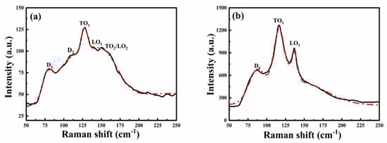 As can be seen in Figure 6, D1 defect peaks are found in both Sample 1 and Sample 2, which is due to the lattice disorder of HgCdTe grown by MBE. Mazur [] studied this peak and found that the peak disappeared after the annealing process. Annealing can improve the crystal quality and make the crystal lattice from disorder to order. The D2 defect peak in Sample 1 is related to Hg-deficiency, which has been previously explained in another article []. There are many Hg-deficiencies on the surface of Sample 1 (as shown in Figure 3a), so the peak related to Hg-deficiency can be detected by Raman spectra. It has been reported that low temperature annealing in Hg atmosphere can reduce Hg vacancies and thus eliminate the Raman peak of Hg vacancies. Moreover, there is a large number of Hg-deficiency in Sample 1, which causes lattice distortion. The shape and position of characteristic Raman peaks LO and TO are mainly related to lattice defects []. Therefore, the LO1 peaks of Sample 1 are not obvious, while the LO1 peaks of Sample 2 are obvious and symmetrical. As shown in Figure 6a, there are TO2/LO2 peaks for Sample 1, which may cause by the uneven surface composition caused by the Hg deficiencies.