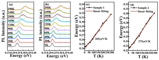 The photoluminescence (PL) is a nondestructive optical test method widely used to detect impurities, defects, and crystal quality of materials. Sample 1 and Sample 2 were subjected to variable temperature PL measurement and excited with a laser power of 100 mW, power density is 1.4 × 105 mW/cm2. Figure 7a,b shows the normalized PL diagram of the samples. It can be seen from Figure 7a,b the PL peaks of the two samples blue-shifted and broadened with the increase in temperature, which is caused by the increase in Cd concentration. Both Sample 1 and Sample 2 have double peaks above 160 K, which is caused by CO2/H2O in the environment []. The asymmetry of the PL spectrum is mainly due to the thermal distribution effect of the high-temperature carrier. At 9 K, the FWHMs of Sample 1 and Sample 2 are 25.2 and 19.2 meV, respectively. The FWHMs of the PL of the Sample 2 are smaller than that of the Sample 1, which proves that the crystal quality of the Sample 2 is better than that of the Sample 1.