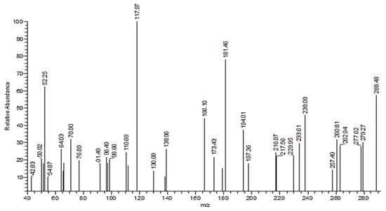 A solution prepared in 30 mL of acetic acid from a mixture of hydrazine derivative 2 (0.01 M) and 2-hydroxybenzaldehyde was heated under reflux for 2 h, then left to cool down and poured into water. The resulting solid was separated and recrystallized from ethanol to give compound 3. M.P = 155 °C; IR (KBr) cm−1 3449 (br–OH), 3046 (NH), 1622 (C=N), 1575, 1486 (C=C), 1390 and 1271 (C–O). 1H-NMR (DMSO-d6) δ: 6.997 (s, 1H, CH=N), 7.38–7.65 (m, 8H, 2Ar–H), 9.01 (s, 1H, OH) and 11.16 (s, 1H, NH) ppm. The suggested structural formula for the ligand (diim) was verified by its mass spectrum (Figure 3). The following peaks were recorded (m/z+) 288, 238, 181, 71, and 43 that correspond to [C15H13N2O2Cl]+, [C15H14N2O]+, [C10H16N2O]+, [C3H8N2]+ and [C2H5N]+ ions, respectively, confirming the proposed molecular structure and formula.