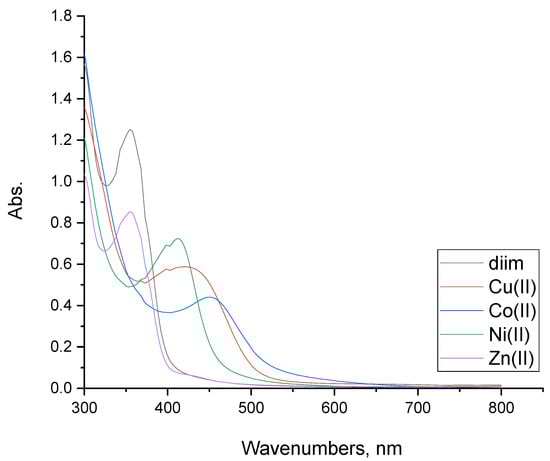 At wavelengths within the range of 300–800 nm, the electronic absorption spectra of diim free ligand and its metal complexes were performed in a DMSO solution (Figure 6). The free diim ligand electronic spectra showed two peaks at 300 and 355 nm corresponding to π−π* and n−π* electronic transitions [19,20,21].