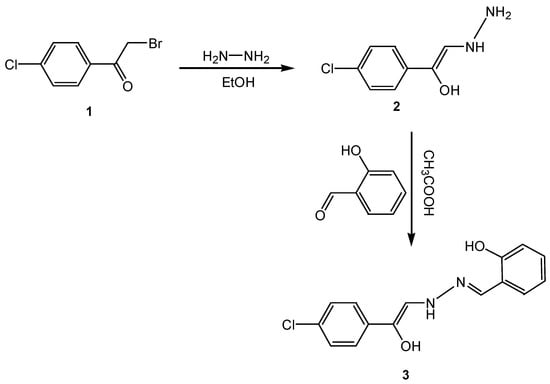 The ligand 2-{[2-(4-chlorophenyl)-2-hydroxyvinyl]-hydrazonomethyl}-phenol (3) was synthesized in two steps. The first step, reaction of p-chlorophenacyl bromide (1) with hydrazine hydrate in ethanol gave 1-(4-chlorophenyl)-2-hydrazinoethenol (2). The second step, condensation of hydrazine derivative (2) with 2-hydroxybenzaldehyde in acetic acid under reflux produced the diimine ligand 3 (Scheme 3).