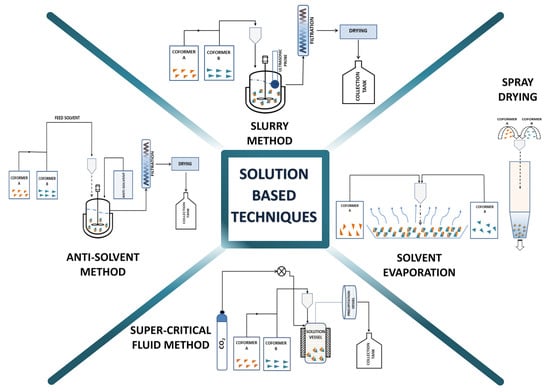 Examples of the solution cocrystallization methods used in order to obtain cocrystals composed of various coformers are given in Table 2. Commonly reported solution cocrystallization techniques could be divided into four major classes, as highlighted in Figure 1. Methodologies and findings from various solution cocrystallization studies are discussed further in this section.