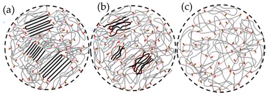 Schematics of (a) random copolymer semicrystalline structure with co-units (red dots) excluded from the crystalline regions; (b) heterogeneous, non-equilibrated melt with crystalline memory: (c) homogeneous equilibrated melt. Adapted with permission from Reference [10]. Copyright (2013) American Chemical Society.