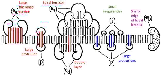Already in 1972, in the context of the “self-decoration” of polymer single crystals, Kovacs and Gonthier [17] have identified different types of decorating sites, which can be encountered on poly(ethylene oxide) (PEO) single crystals grown from the melt (see Figure 3). This includes sharp edges of basal lamellae (eb) or spiral terraces (es), double layers (ed) or large thickened portions (ee), all involving row nucleation. Surface decoration involving needle-like nucleating sites may arise either from rather large protrusions (p) or smaller irregularities (i), which may uniformly cover the entire surface of the crystals.