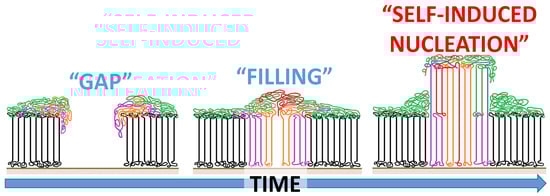 A nucleation mechanism, termed “self-induced nucleation”, based on the insertion of polymers into a branched primary lamellar crystal, has been proposed (see Figure 4) [22]. The space in between crystalline lamellae branches is identified as sites for nucleation on the amorphous fold surface. We note that central aspects of the proposed mechanism are similar to nucleation of “giant screw dislocations” induced by “lacunae” (representing “small, almost imperceptible ‘slits’ that may develop naturally in the growth process”) identified by Keith and Chen [18].