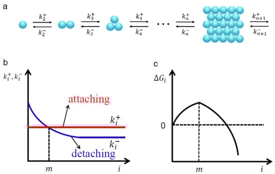 Microscopic kinetics of nucleation of small molecular crystals. (a) Scheme showing the microscopic process of attaching and detaching. and indicate the rate constant for attaching a molecule to form a nucleus containing molecules and detaching a molecule from a nucleus containing molecules; (b) variation of the rate constants of attaching and detaching with nuclei size; (c) free energy change of formation of nuclei containing different numbers of molecules. The symbols i and m indicate the number of molecules within the nucleus and that within the critical nucleus, respectively.